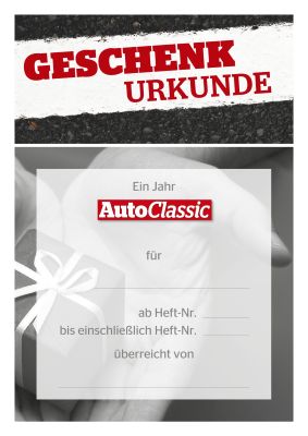 Mit dem Geschenkabo von Auto Classic verschenken Sie pure Leidenschaft. Sie können sich sofort eine Geschenkurkunde ausdrucken und dem Beschenkten überreichen, den Rest übernehmen wir.