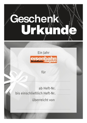 Mit dem eisenbahn magazin verschenken Sie jeden Monat pure Leidenschaft und Expertenwissen. Sie können sich sofort eine Geschenkurkunde ausdrucken und dem Beschenkten überreichen, den Rest übernehmen wir. Dazu erhalten Sie eine hochwertige Dankeschön-Prämie zum Behalten oder Verschenken. Kein Risiko - das Geschenkabonnement endet automatisch.