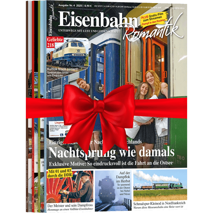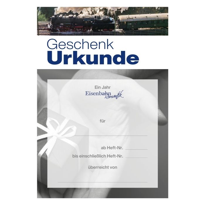 Mit dem Eisenbahn-Romantik Magazin verschenken Sie ein Jahr (4 Ausgaben) pure Leidenschaft und Inspiration für Fans. Sie können sich sofort eine Geschenkurkunde ausdrucken und dem Beschenkten überreichen, den Rest übernehmen wir. Dazu erhalten Sie eine hochwertige Dankeschön-Prämie zum Behalten oder Verschenken. Kein Risiko - das Geschenkabonnement endet automatisch.
