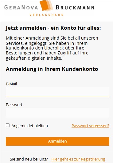Wenn Sie Kunde bei GeraNova Bruckmann sind, haben Sie auch ein Kundenkonto in unserem Online-Shop verlagshaus24.com. Sie können sich jederzeit in Ihrem Kundenkonto anmelden, um auf Ihre digitalen Ausgaben zuzugreifen. In Ihrem Kundenkonto haben Sie Zugriff auf alle digitalen Ausgaben, die Sie auf verlagshaus24.com gekauft haben oder die in Ihrem Abonnement enthalten sind.