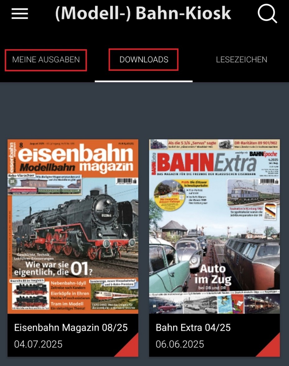 (Modell-)Bahn-Kiosk, inkl. MIBA, MIBA Spezial, ModellEisenBahner, Bahn Extra, Digitale Modellbahn, eisenbahn magazin, Eisenbahn Romantik, N-Bahn Magazin, Straßenbahn Magazin, Lok Magazin: erhältlich bei Apple und in der Browser-Version