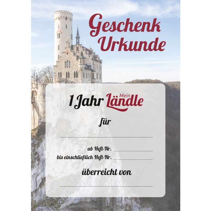 Mit Meine Ländle verschenken Sie ein Jahr (6 Ausgaben) die schönsten Seiten aus dem Südwesten. Sie können sich sofort eine Geschenkurkunde ausdrucken und dem Beschenkten überreichen, den Rest übernehmen wir. Dazu erhalten Sie eine hochwertige Dankeschön-Prämie zum Behalten oder Verschenken. Kein Risiko - das Geschenkabonnement endet automatisch.
